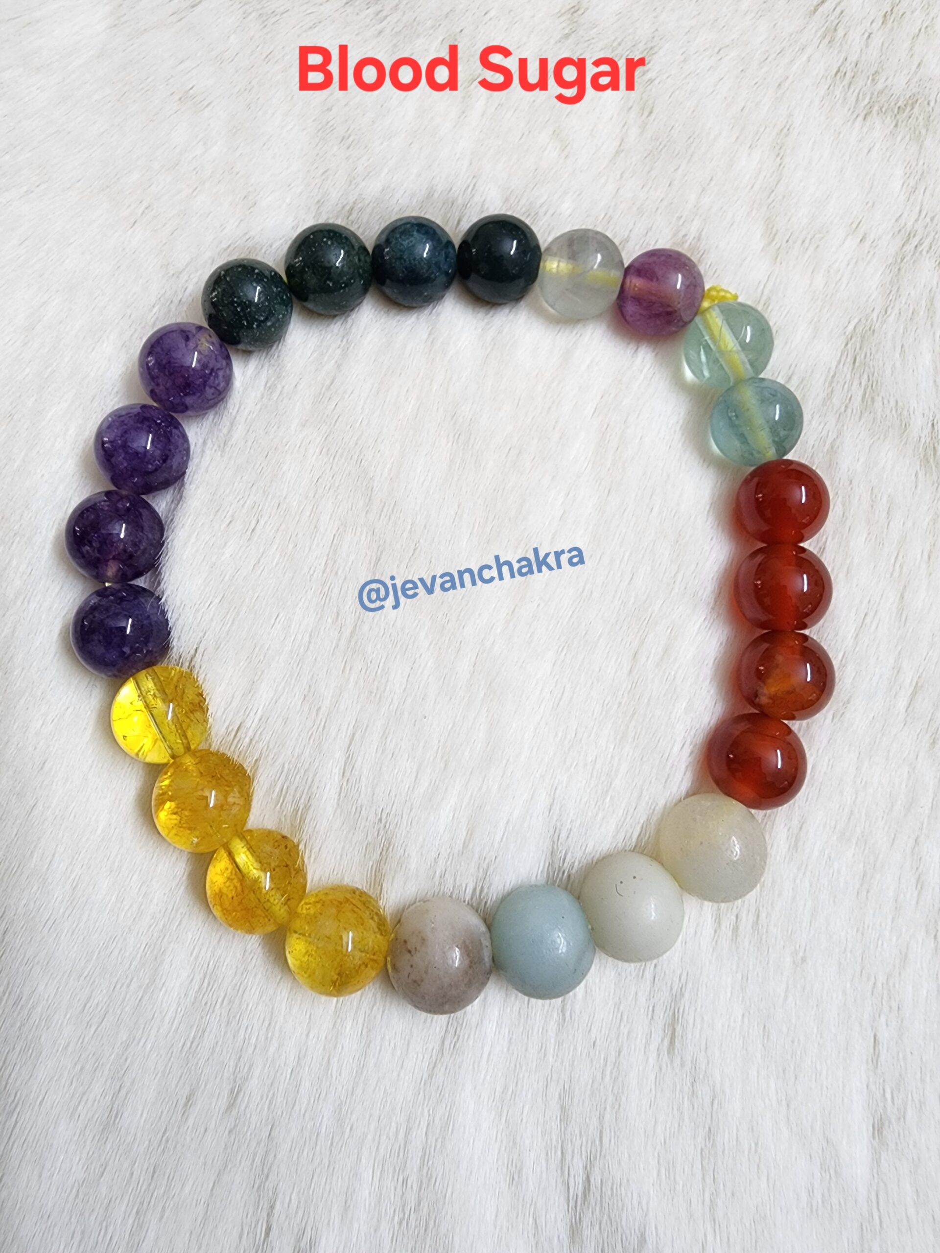 A combo bracelet for blood sugar typically incorporates crystals believed to support overall health, balance, and energy, particularly for individuals managing blood sugar levels. While these crystals are not a substitute for medical treatment, they are often used as complementary tools for promoting wellness. Stabilizes Blood Sugar Levels: Certain crystals, like Citrine and Bloodstone, are believed to help regulate energy flow in the body, which can aid in stabilizing blood sugar levels. These stones may support the body’s natural ability to maintain healthy glucose metabolism. Boosts Energy and Reduces Fatigue: Crystals such as Carnelian and Garnet are thought to increase vitality and reduce fatigue, common issues for individuals with blood sugar imbalances. By enhancing energy levels, these stones may help combat the tiredness and lack of stamina often associated with blood sugar fluctuations. Balances Emotional Well-being: Imbalances in blood sugar can often lead to mood swings or irritability. Crystals like Amethyst is believed to soothe emotional distress, reduce stress, and encourage a sense of calm, which can be helpful in managing the emotional side effects of blood sugar issues. Supports Detoxification and Healing: Stones like Fluorite and Sodalite are associated with detoxifying properties, helping the body cleanse and maintain a healthy balance. For individuals managing blood sugar, detoxification can be beneficial in promoting overall well-being and helping the body function optimally.