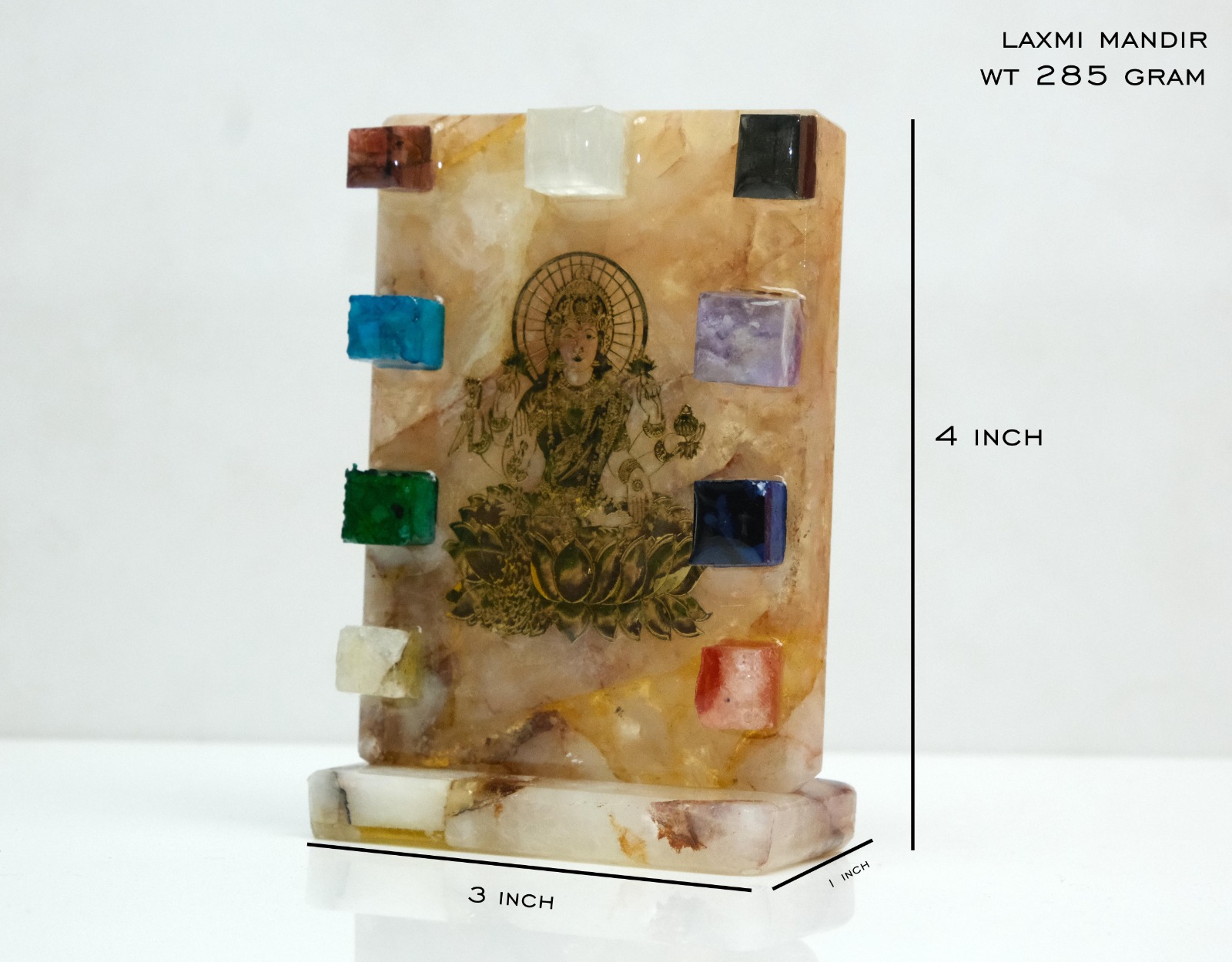 Secondly this stand has Maa laxmi's metalic sticker and is paired with crystals such as amethyst, carnelian, turquoise, pyrite, citrine, green jade, lapis and selenite.