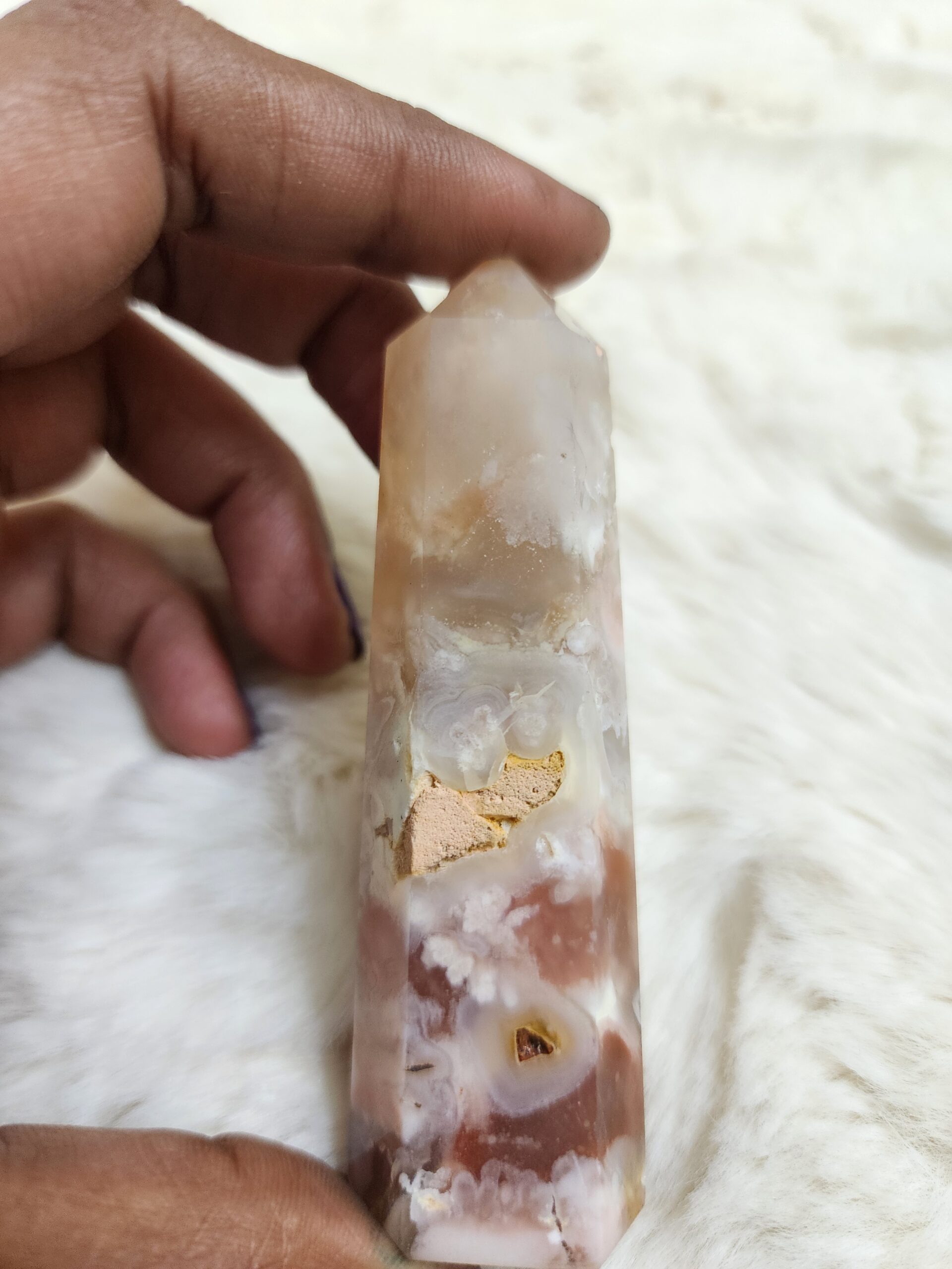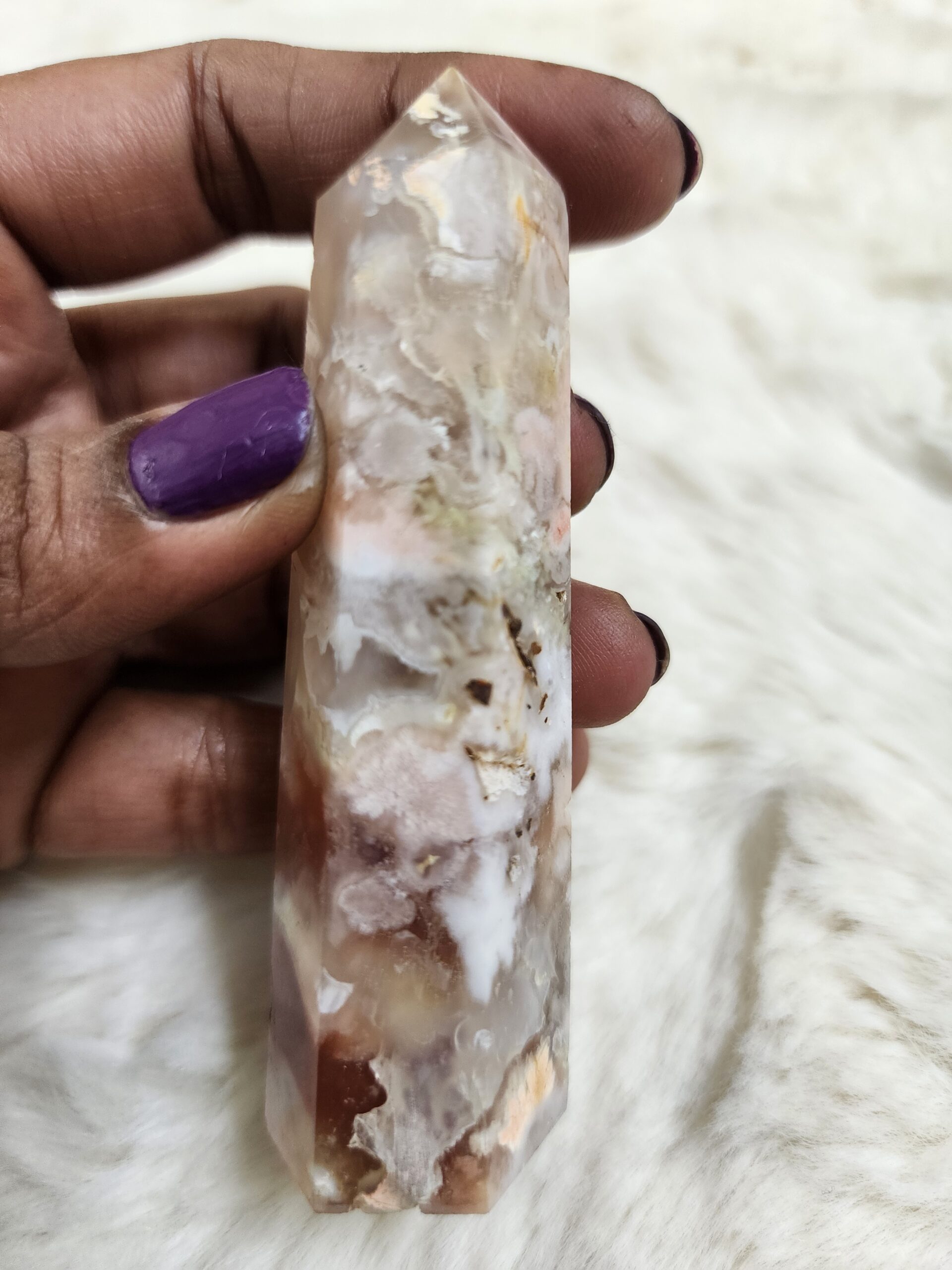 *FLOWER AGATE OBELISK* The cycle of life from seed to blossom is depicted in three dimensional blossoms of Flower Agate. Sourced from Madagascar, this is a rare variant of plum agate. Flower Agate is considered to be encompassing the entire cycle of life in it. This is amazing to lead you to your dreams with ease and helps in growing in whichever direction or form you may wish to grow. Results in shedding off the blockages by emotions and other belief systems and thus evolving truly like a flower in full glory.