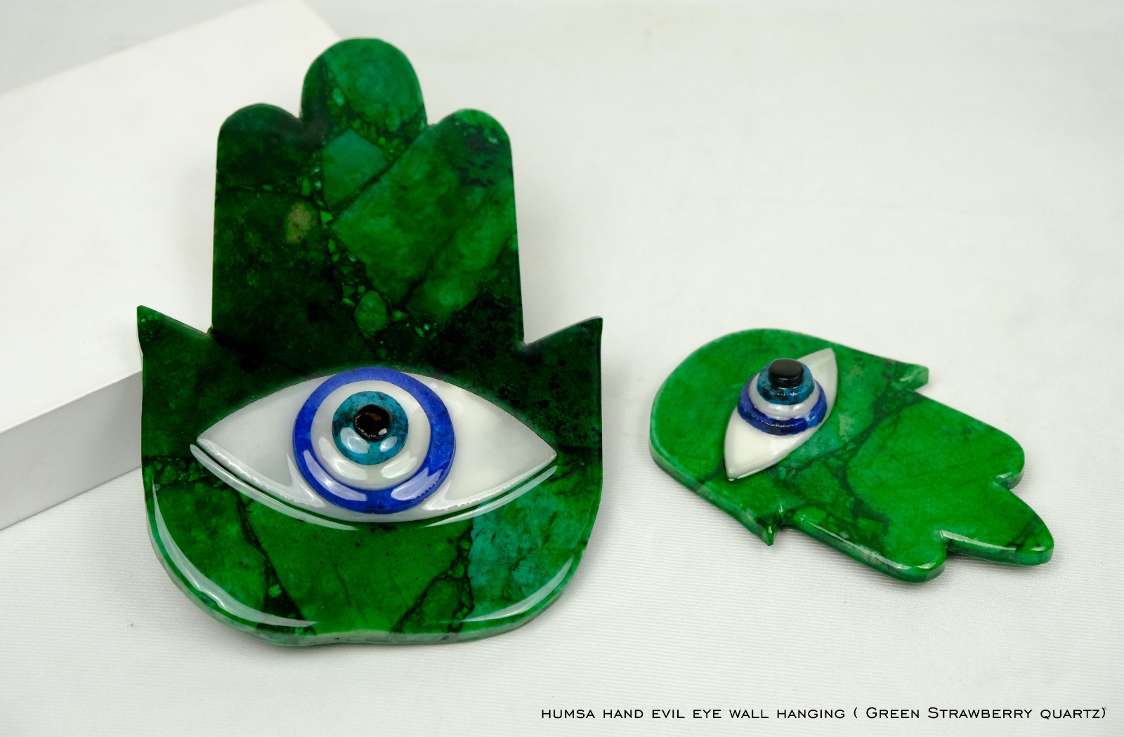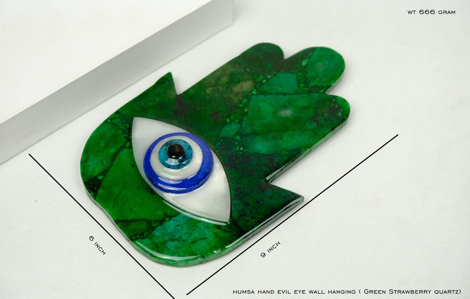 " GREEN STRAWBERRY HAMSMA" Presenting one of the most amazing crystal which can be highly effective for addressing financial issues. This creation is made with green Strawberry quartz as Hamsa Hand with Evil Eye Formation. Why is this important: Green Strawberry is effective to heal emotional blockages and those which you may be carrying as blockages and trauma. This crystal can help you to heal your trauma and pain and to look forward in life. Because without healing yourself from pain and trauma you can not address any aspect of life. Also being paired with evil eye it serves as a strong protection tool to safeguard your energy and space. You can program it to not only heal but to safeguard yourself and your family members. Hamsa is one of the most sacred formation and is considered strong enough to save you and your energies and your family from evil eye besides healing emotional pain and trauma.