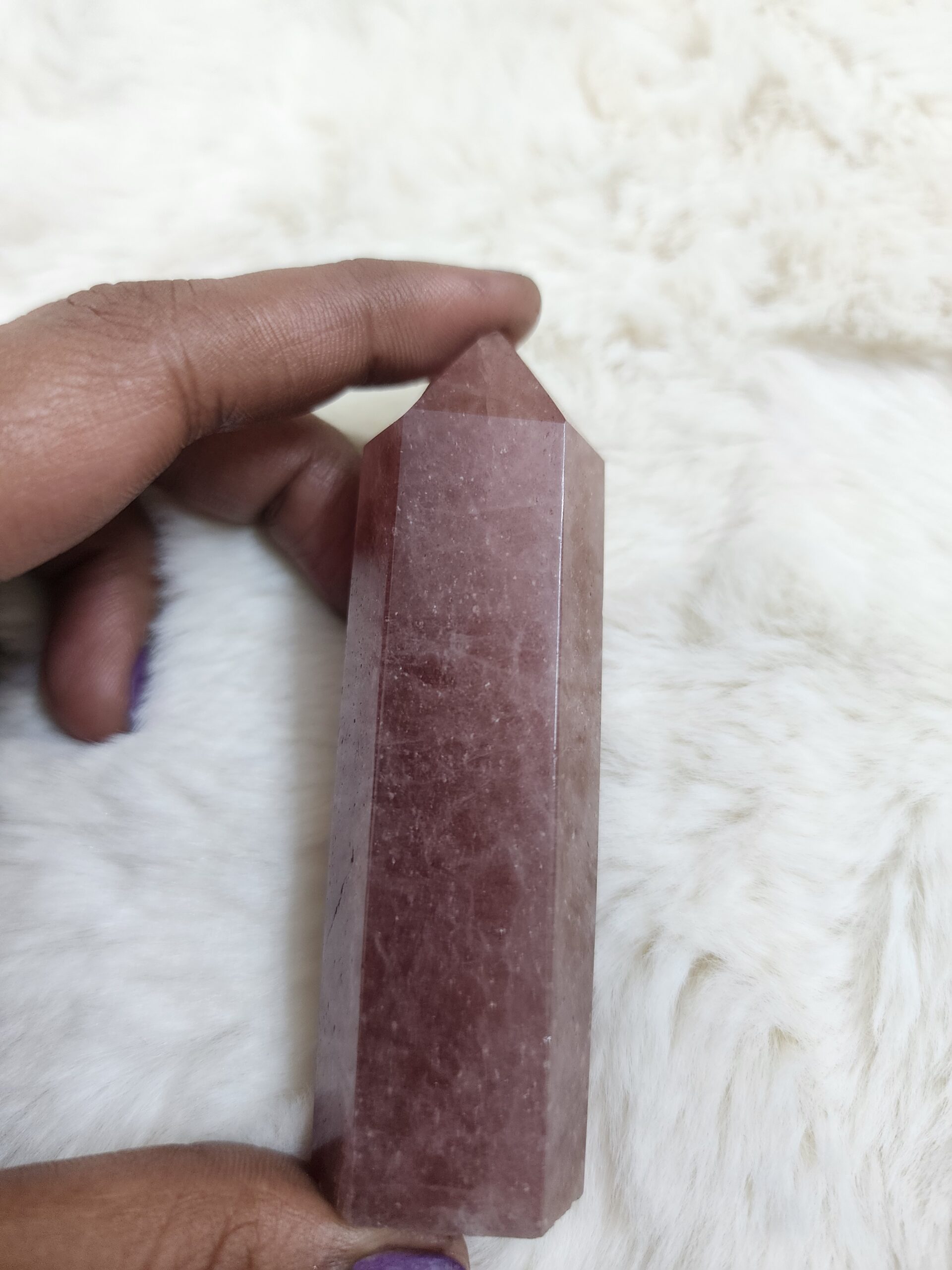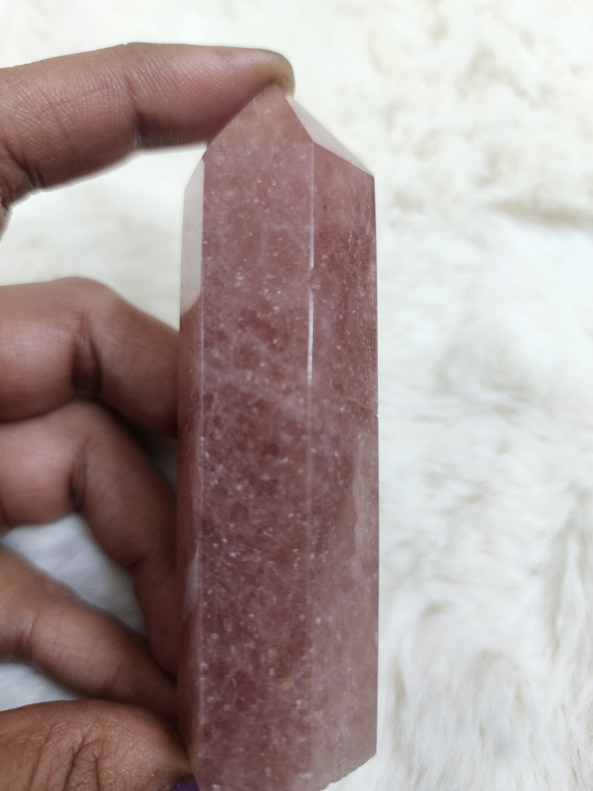 *STRAWBERRY QUARTZ OBELISK* This beautiful crystal is soothing and quite difficult to get and we have been able to import high quality tumbles in limited quantities. Strawberry Quartz is a amazing crystal which is a rare variety of quartz called so due to the textured surface of this crystal. It enhances the ability to understand love and accept it. As it stimulates the heart chakra it opens up to abundance. This soothing crystal could be used to gain inner knowledge and understand one's purpose of life. This is a beautiful and soothing energy to infuse trust and belongingness in life. It helps you to be more willing and open to create love and compassion in your relationships. This could be effectively used to heal the trust issues in relationships and to create a more positive and harmonious environment. It could also be used to create a learning environment for children.