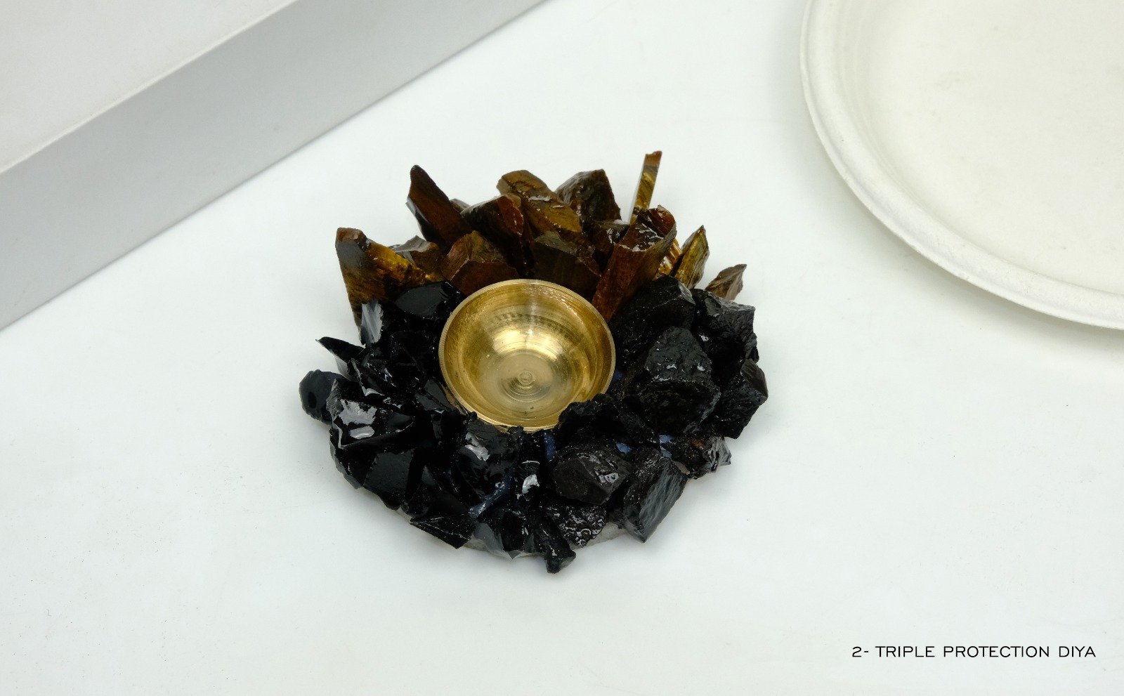 New Exclusive Cluster Diya TRIPLE PROTECTON DIYA This Diya is made with the mixture of three powerful Crystals Tigers Eye+Black Obsidian+Hematite Every house, Office, Business Place, Factory, Industries, School, College, Institution should have this powerful piece of Protection. How to use? Burn Diya placing Tea light Candle on it. With the intention that all members of the Family are always in protection shield. Light Diya once in the morning and once in the evening. While lighting Diya in the morning: say- All members of the family/office/industry/etc. are now in a protection shield no negative energies, black magic, evil eye, bad effects of planets or any low energies can touch them. While lighting Diya in the evening: Say thank you Universe/God/ Angles/Masters and Divine Crystals for your portection for all day, now i pray that our night should also be blessed with Positive energies only, surround us with your powerful protection shield of Tigers Eye, Black Obsidian and Hematite. Thank You x3 SHARE YOUR EXPERIENCE WITH US WE WILL BE HAPPY TO BE THE PART OF YOUR HAPPINESS
